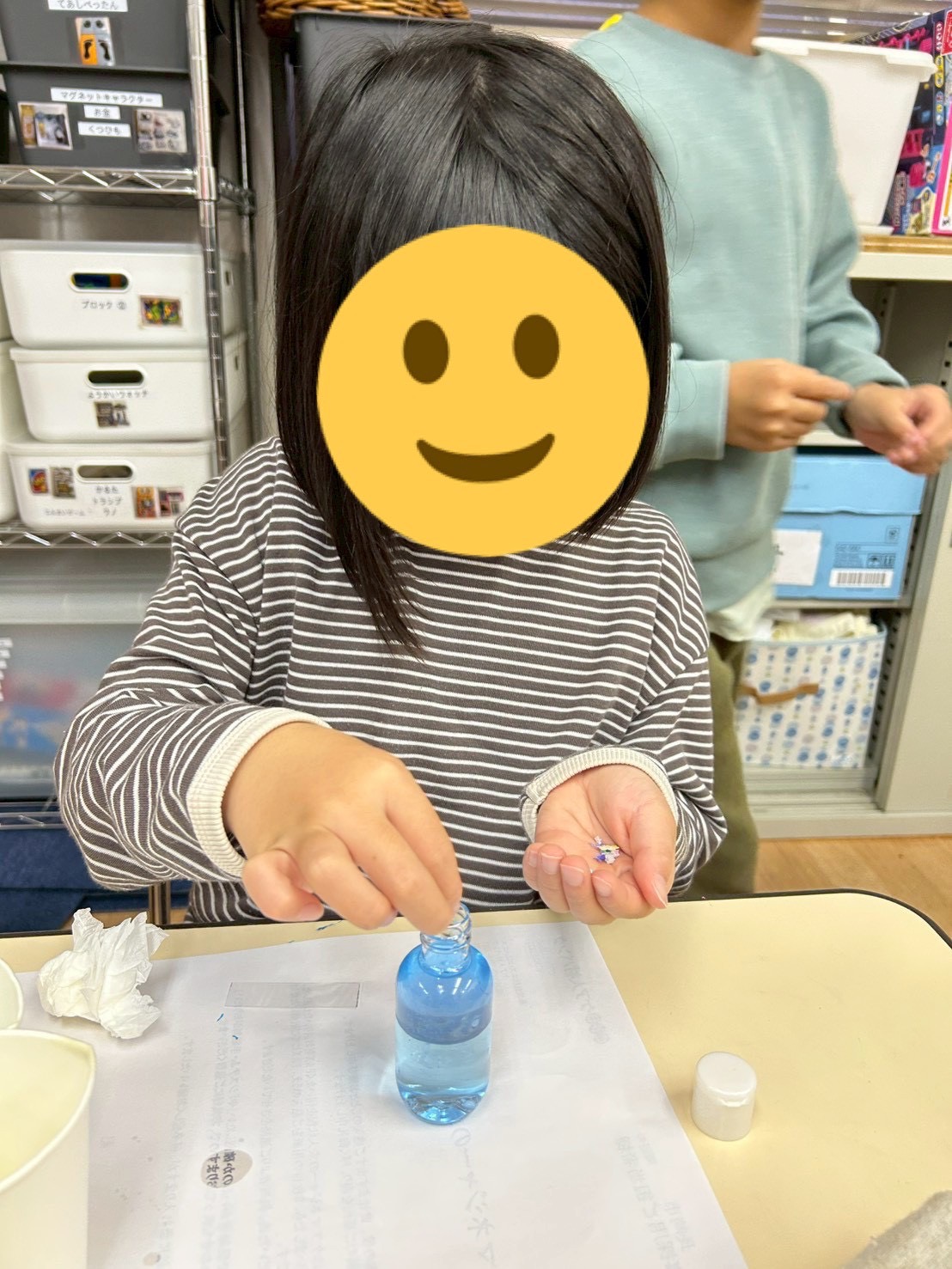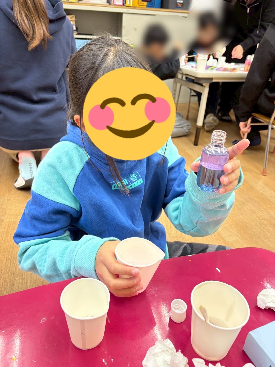ベビーオイルと水を使い、色が交わらない不思議なボトルにみんな興味津々!