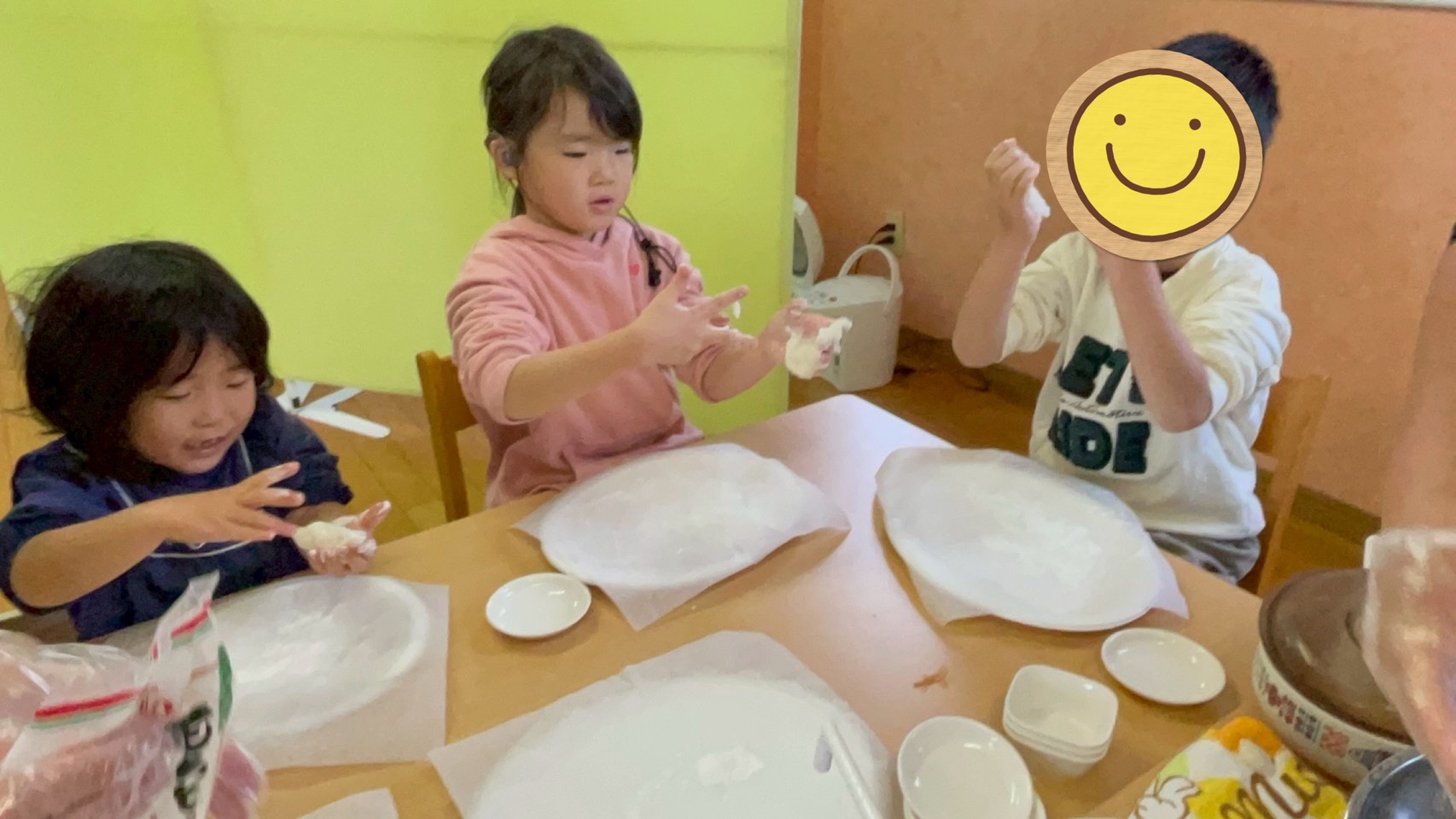 出来上がったお餅は、子どもたちが手にくっつけながら一口サイズに丸め、きなこをかけて美味しくいただきました✨