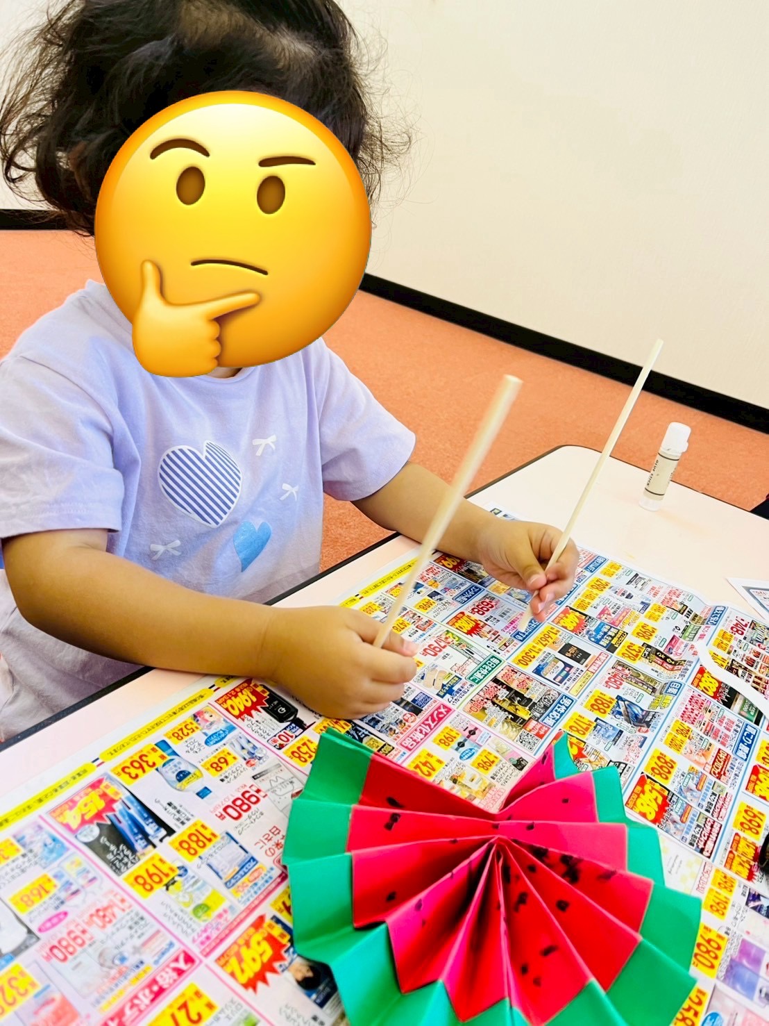 かわいい作品が沢山出来上がりました。8/4に作った風鈴は、8/6に大村にある事業所の「こでまり」さんにプレゼントしました。プラバンモビールや貼り絵などは、手元に集中し、取り組む姿も見られました。うちわのすいかはかわいらしかったですね![]()